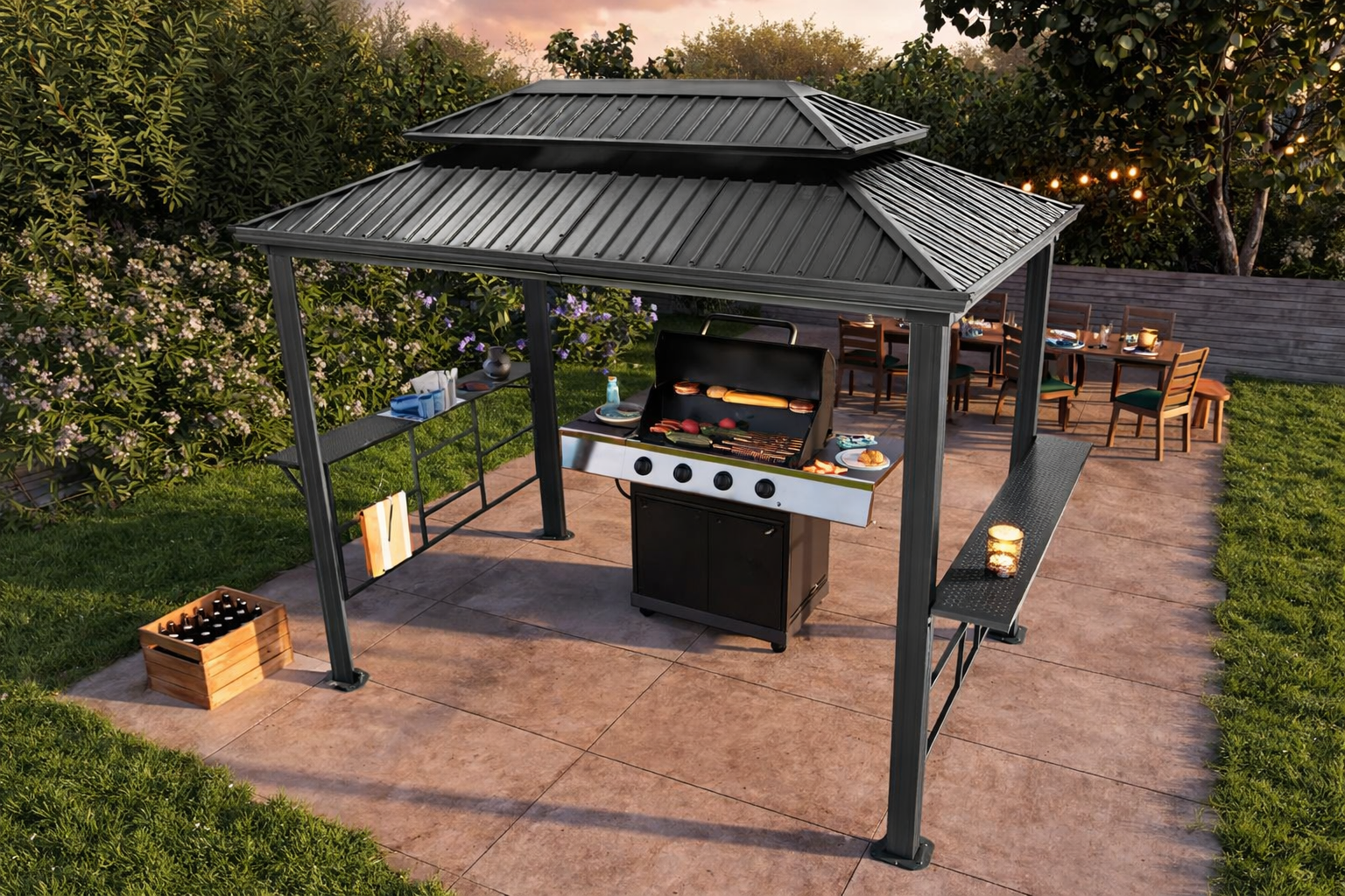 Čvrsto građen, praktično opremljen i siguran: Ovaj paviljon za roštilj, izrađen od nehrđajućeg aluminija i robusnih čeličnih spojeva, pretvara svako okupljanje uz roštilj u nezaboravno iskustvo. Elegantni i visokokvalitetni čelični krov pouzdano štiti od UV zračenja i kiše, dok integrirani otvor za ventilaciju sprječava ulazak dima s roštilja. Dvije bočne police pružaju dovoljno prostora za hranu, pribor za roštilj i piće. Uljepšajte svoj vanjski prostor ovim privlačnim paviljonom za roštilj!